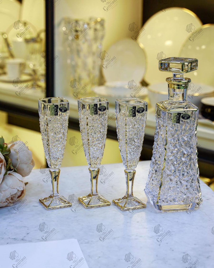 تصميم ملكي فاخر بلون ذهبي بالكامل – الكاسات والقارورة والغطاء، كأنهم مطليين ذهب!