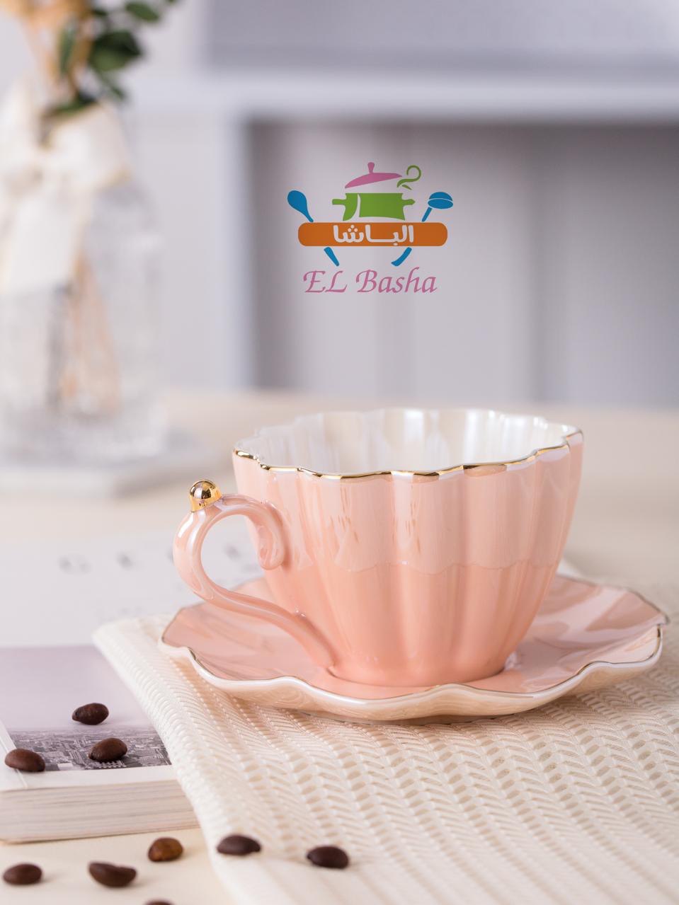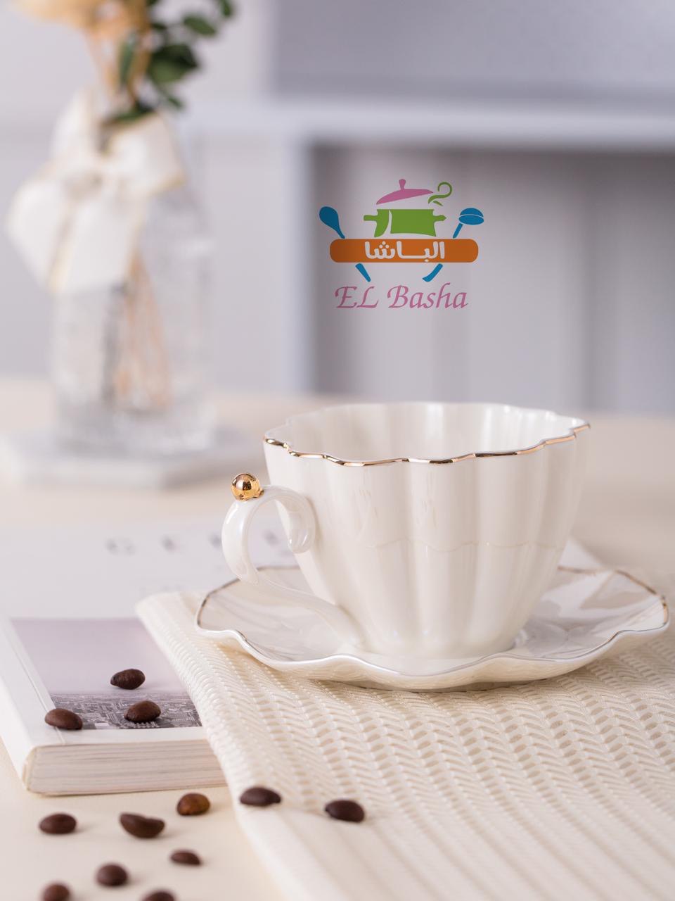 الطقم نفسه بفريم ذهبي ناعم حوالين الفناجين والأطباق والبراد، ينعكس عليه الضوء بنعومة، والخامة بورسلين حراري لامع جداً ونضيف.