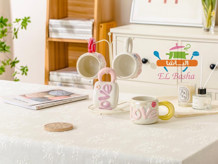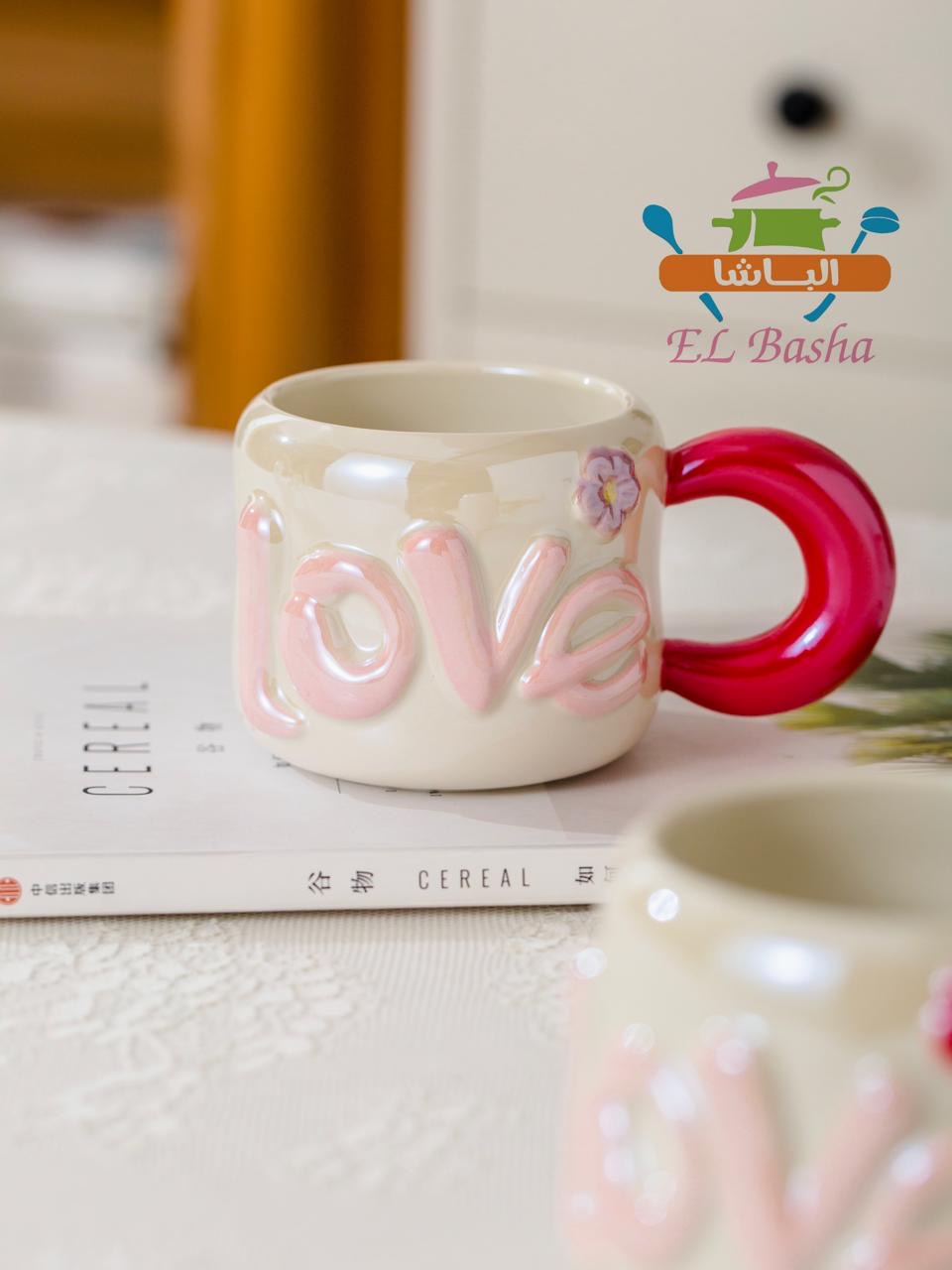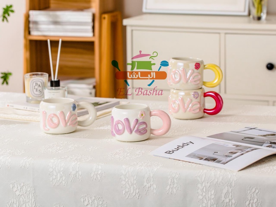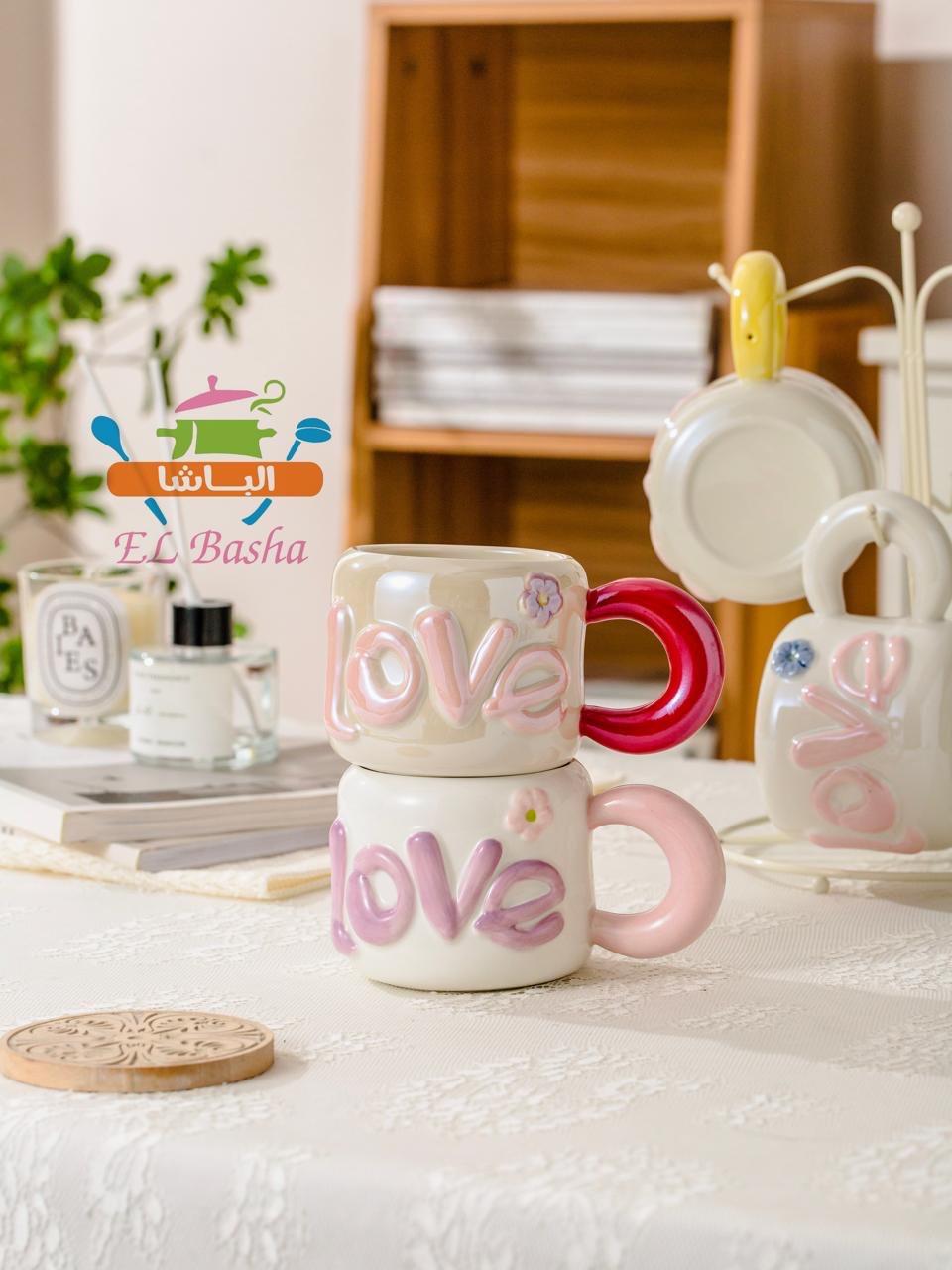 مجّات أنيقة بتصميم راقٍ، مزينة بكلمة LOVE بارزة على المج نفسه.