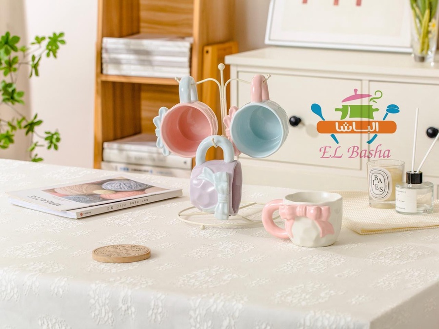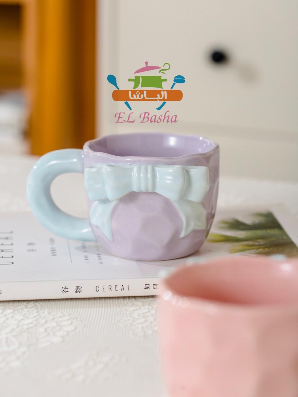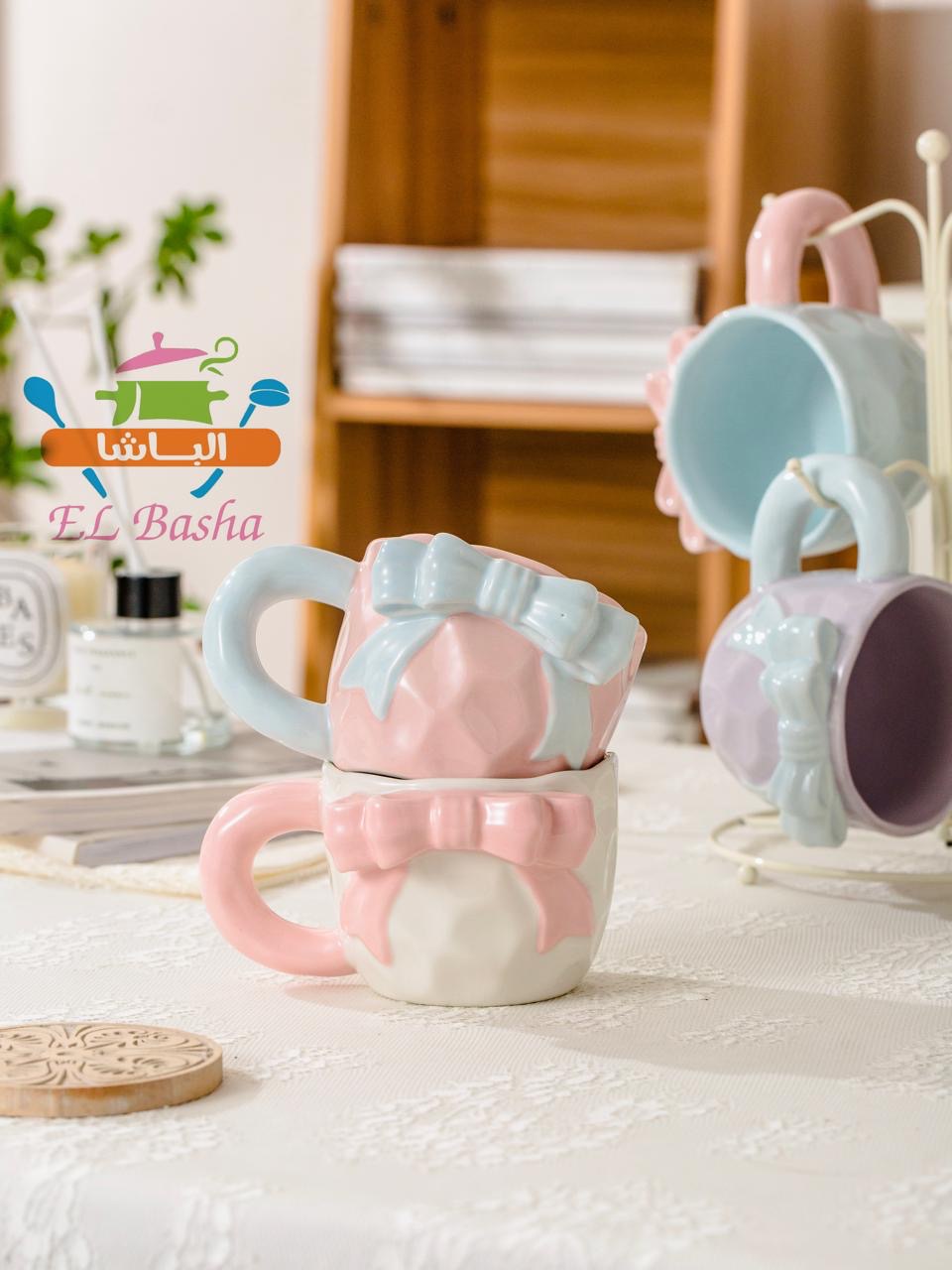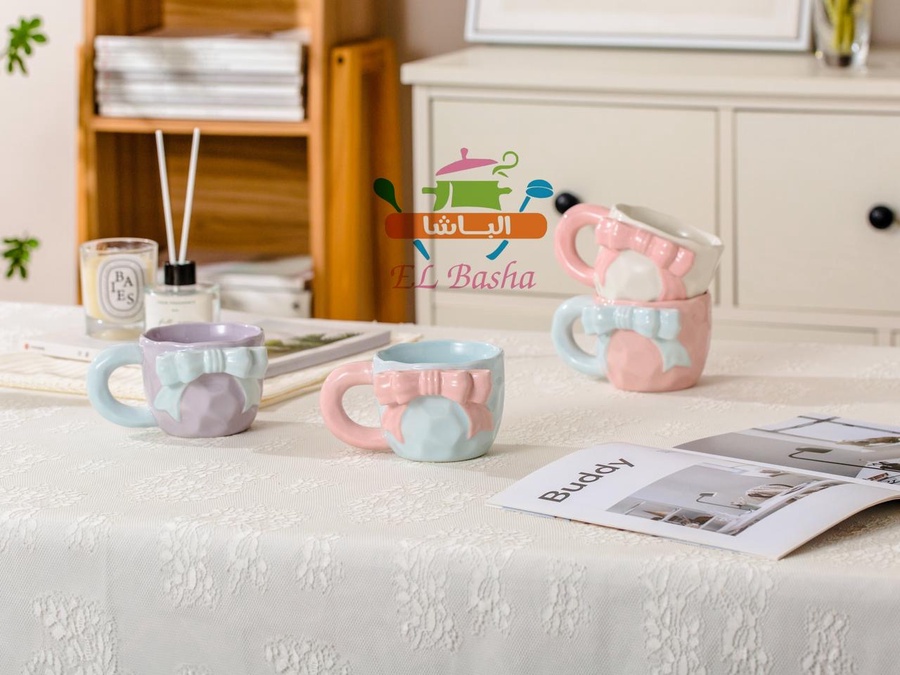 مجّات أنيقة بتصميم فاخر، مزينة بشكل فيونكة بارز على المج نفسه.