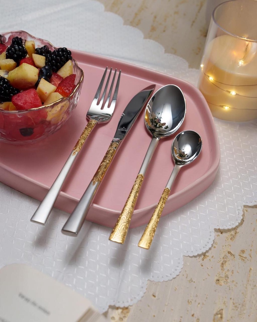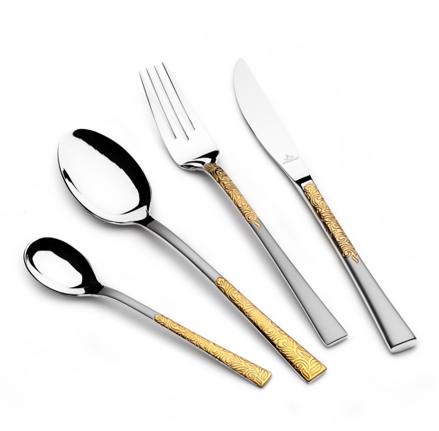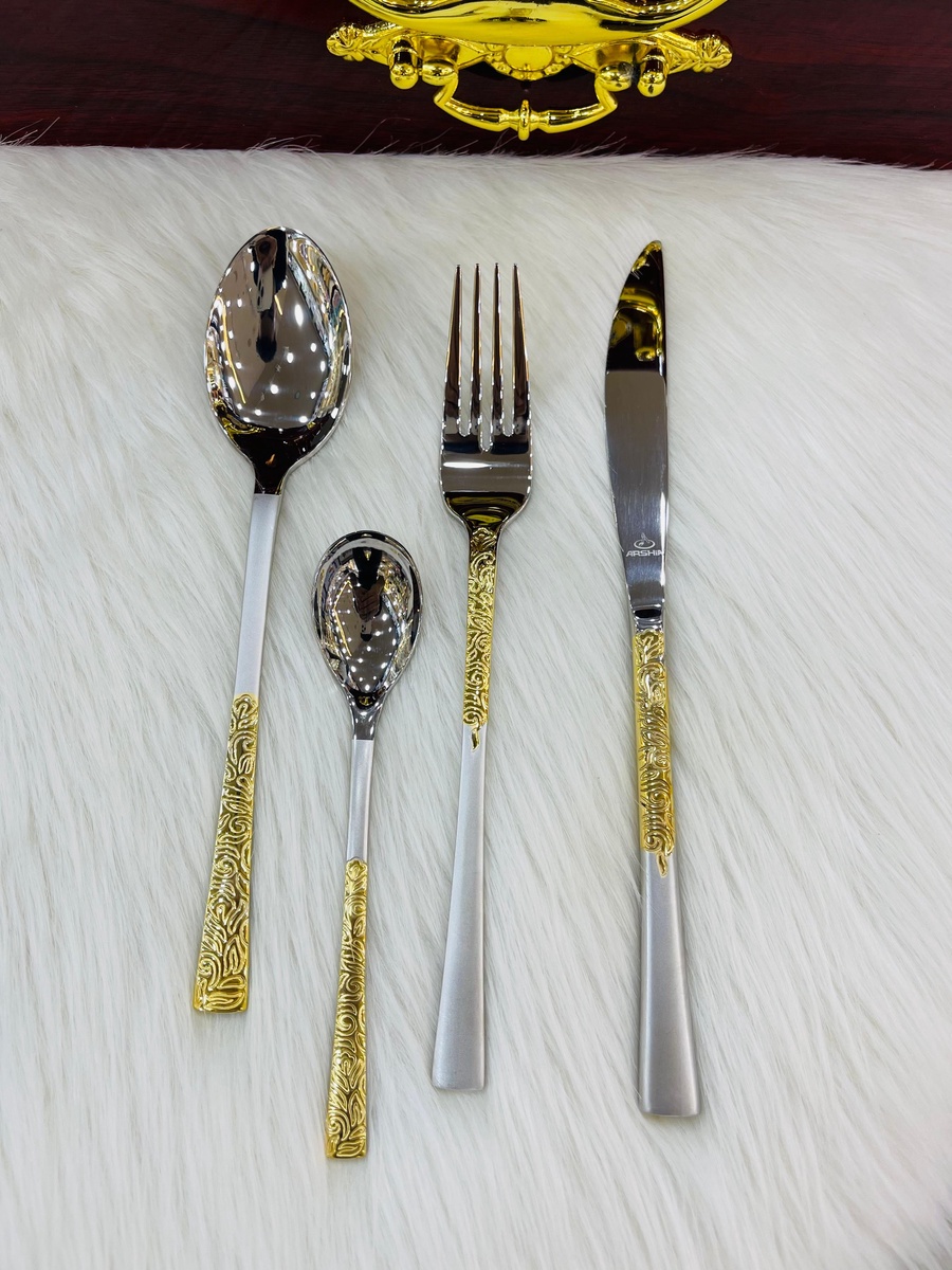 نقدم لكم طقم أدوات المائدة الرائع "أرشيا" المكون من 86 قطعة، باللونين الذهبي والفضي، وهو تشكيلة رائعة صُممت لتبهر الجميع. تجمع كل قطعة بين الأناقة الخالدة والحرفية الاستثنائية، وهي مصنوعة من الفولاذ المقاوم للصدأ الفاخر بلمسة نهائية ذهبية لامعة، مما يُبرز تصميمًا أنيقًا وعصريًا. تُعدّ هذه المجموعة إضافة مثالية لأي طاولة.