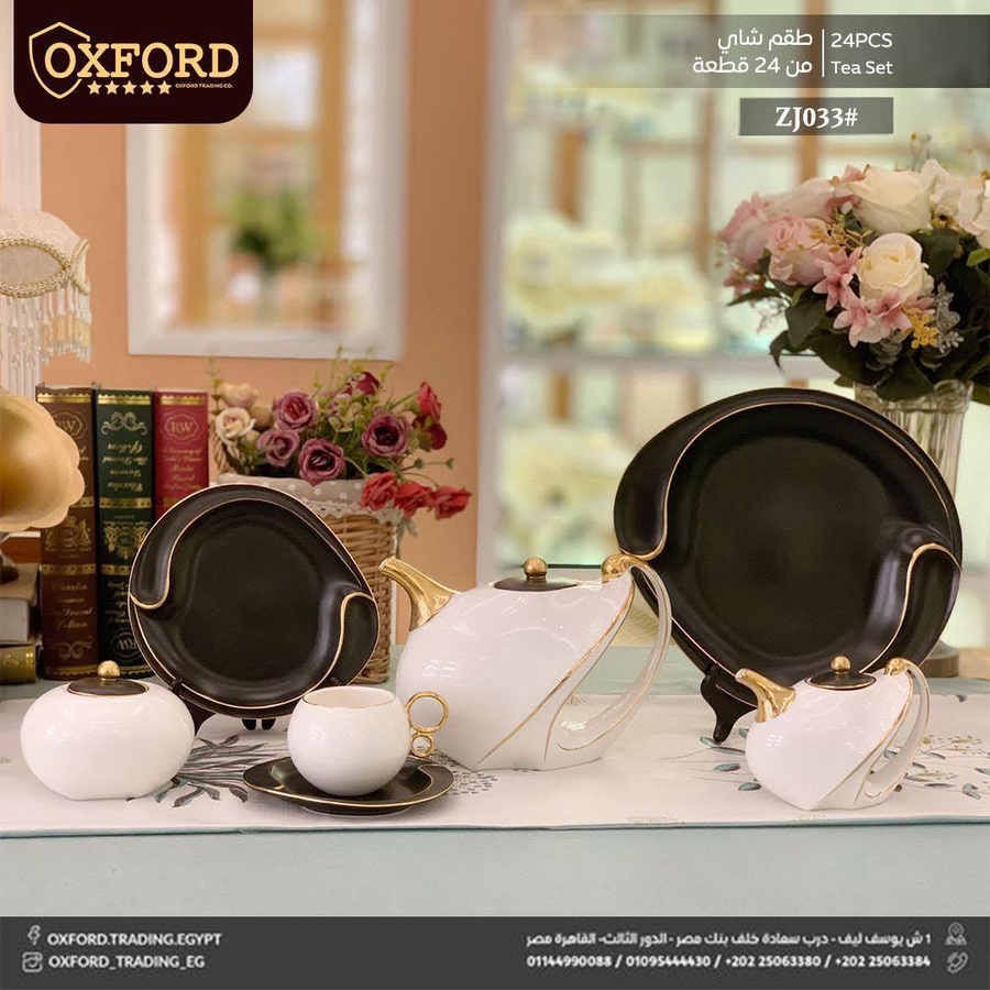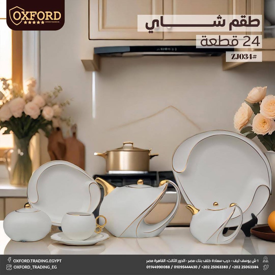 طقم مميز بخامة بورسلين حراري مستورد، خفيف الوزن ومطعّم بتفاصيل ذهبية تضيف لمسة راقية إلى ضيافتك.
